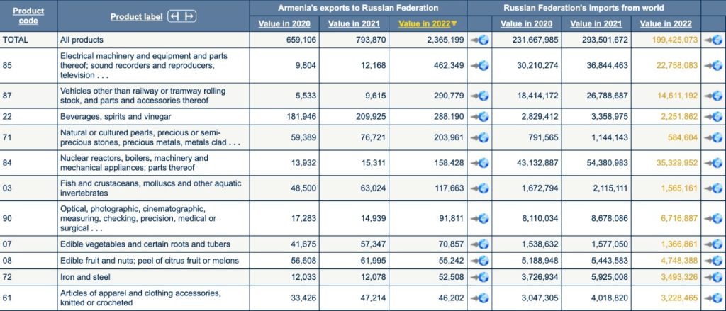 As to the TradeMap data, Armenia achieved a significant surge in exports to Russia of two categories of non-domestic products in 2022. Armenia increased its exports to Russia by 38 times, from 12,168K to 462,349K, for the goods under the category “Electrical machinery and equipment and parts thereof; sound recorders and reproducers; television.” Also, Armenia boosted its exports to Russia by 30 times, from 9,615K to 290,779K, in the category “Vehicles other than railway or tramway rolling stock, and parts and accessories thereof.”.