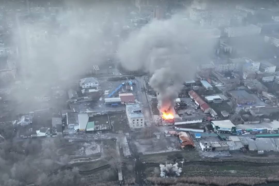 The published footage shows a thick cloud of smoke over Bakhmut – the consequences of constant missile attacks. Some of the buildings in the video are still on fire.