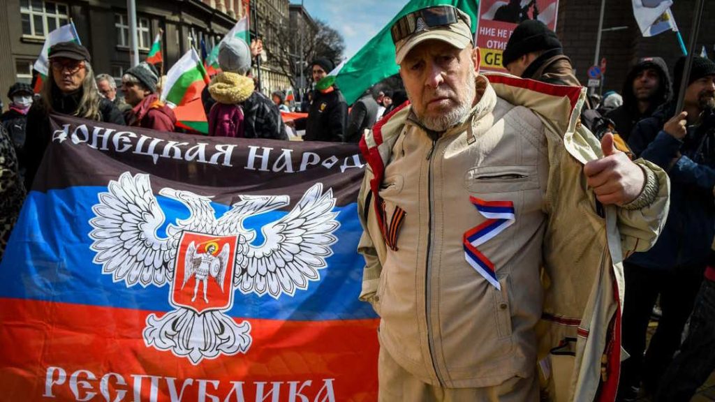 Photo: Photo: Supporters of Pro-Russian party Vazrazdane (Renascence) hold flag of Self-proclaimed Donetsk People’s Republic on protest in front of Council of Ministers building during U.S. Secretary of Defense Lloyd Austin two days visit in Bulgaria on 19 March, 2022 in Sofia, Bulgaria. Credit: Georgi Paleykov/NurPhoto