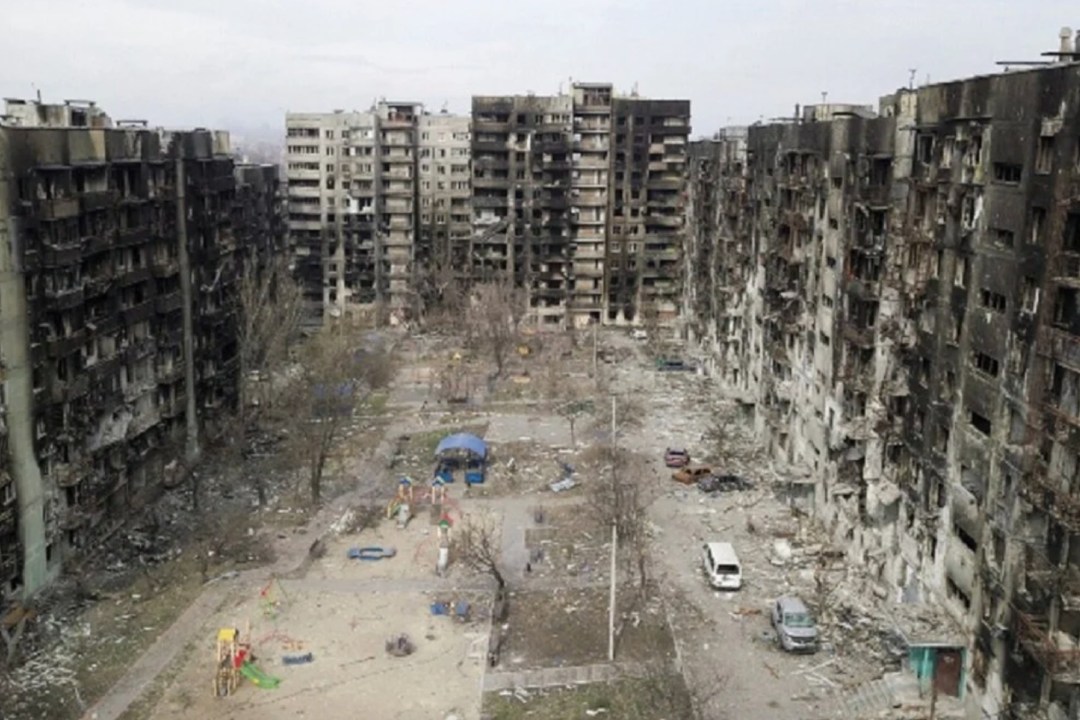 The picture showed the wreckage of the Mariupol Drama Theater, which Russian aircraft bombs demolished, killing many who were hiding inside from strikes, and Russian invading authorities are currently rebuilding it.