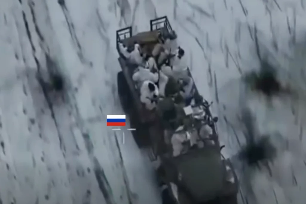 Picture: A screenshot from a recent video posted by the 110th brigade of the Ukrainian armed forces showing a convertible made from a Russian Ural truck, full of invading soldiers, which the Russian army used to assault Ukrainian positions, with a commentary claiming that “Ukrainians destroyed the Russian ground forces, and now unprofessional and poorly trained soldiers are sent to fight.” This video shows later on how all those assault soldiers were eliminated with FPV drones and artillery strikes.