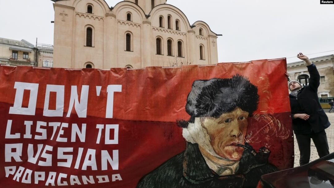Photo: An activist holds a banner with a portrait of Dutch artist Vincent van Gogh as he demonstrates outside the Dutch embassy in Kyiv, Ukraine, Feb. 5, 2016, Reuters.