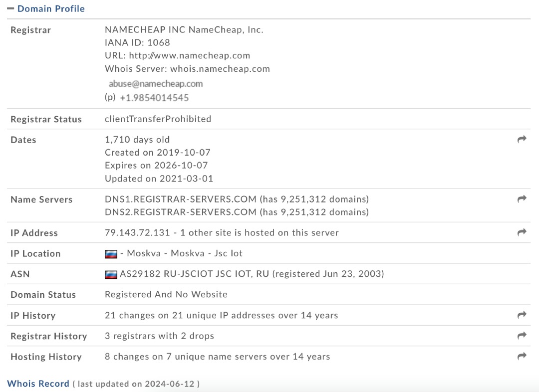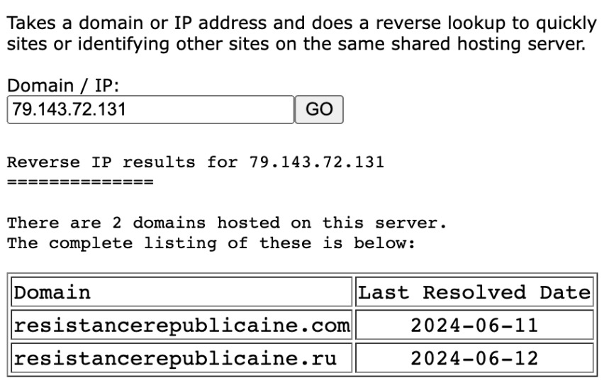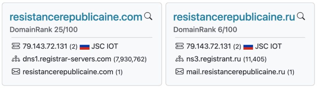 Using search tools and publicly available information, we discovered that resistancerepublicaine.com is registered and hosted in Moscow. Apparently, this is why a ‘.com’ domain was chosen rather than a ‘fr’ one, which is intended for French online resources. Given the highly controversial publications, France could have imposed sanctions on the .fr domain much easier.