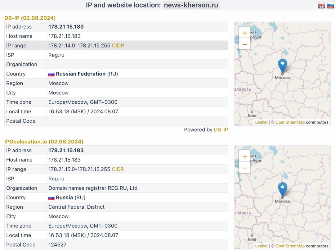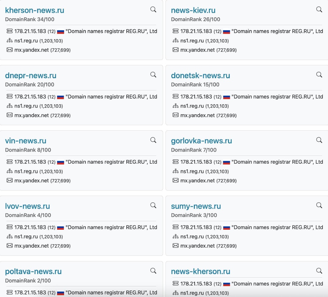 The list includes the websites with nearly identical web design, Russia’s war symbols (Z). All of these websites are hosted on .ru domains; they were registered in Moscow, and they are being served from the same Russian IP address, meaning those “regional Ukrainian news outlets” share the same Russian server.