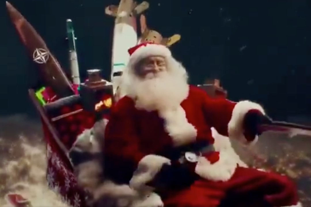 The video shows Santa Claus flying over New Year’s Eve Moscow in a reindeer-drawn sleigh, holding a can of Coca-Cola in his hand and missiles with NATO emblems in the sleigh behind him.