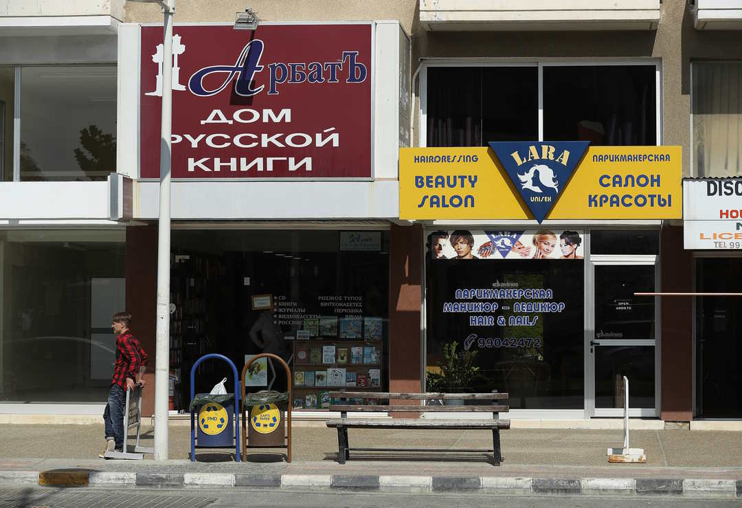 Photo: A Russian bookstore and a Russian beauty salon in Limassol. Photographer: Sean Gallup/Getty Images